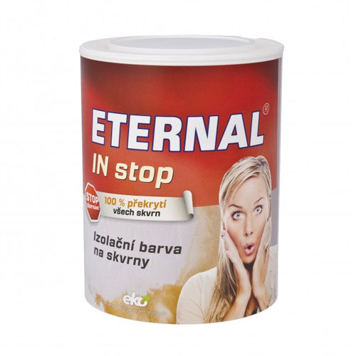 Interiérová izolační nátěrová hmota zabraňující průniku skvrn z podkladu do nové malby. Touto barvou lze izolovat skvrny v zakouřených místnostech restaurací, bytů aj., skvrny po prostupujících starých malbách, zalékání, rzi, sazích. Je vhodná i pro eliminaci skvrn vystupujících ze dřeva, dřevotřískových a dřevovláknitých desek při nátěrech disperzními barvami apod. Nanáší se v jedné až dvou vrstvách, pro správnou funkci musí každý nátěr dokonale proschnout. Na tomto odkazu Eternal In stop zakoupíte